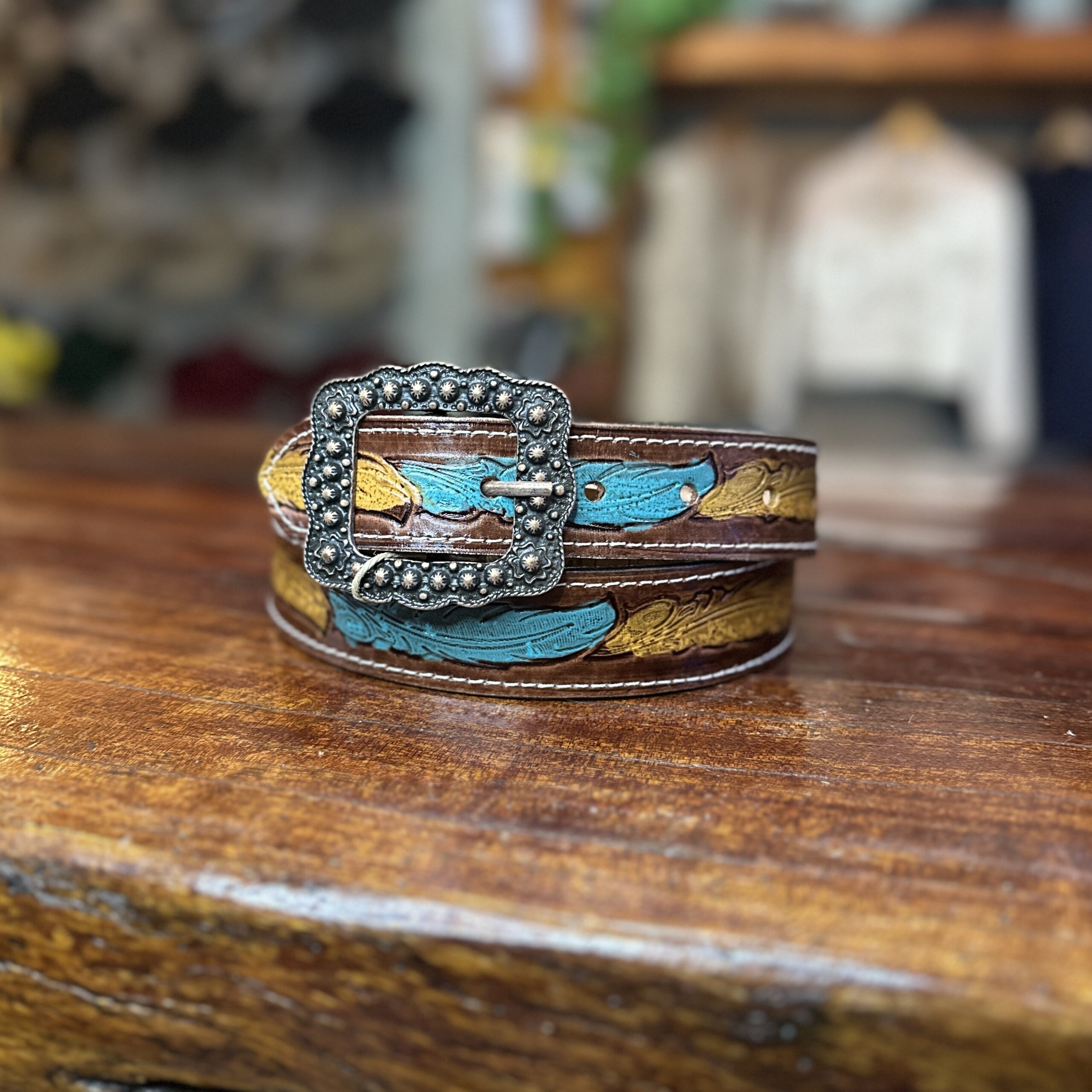 CINTO FIVELA QUADRADA BRONZE FOLHAS AZUL