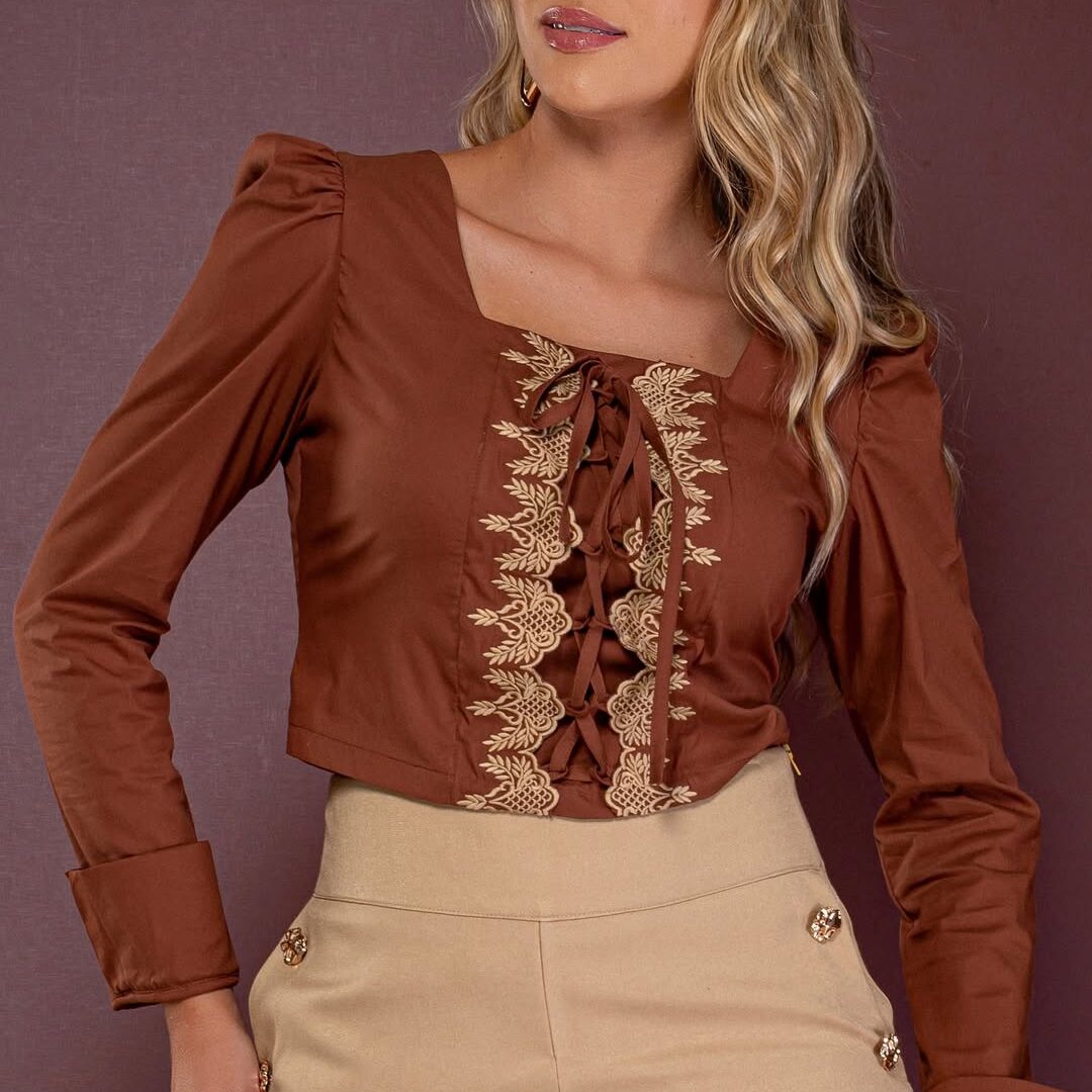 Blusa bordada disponível na cor BEGE com bordados marrom.