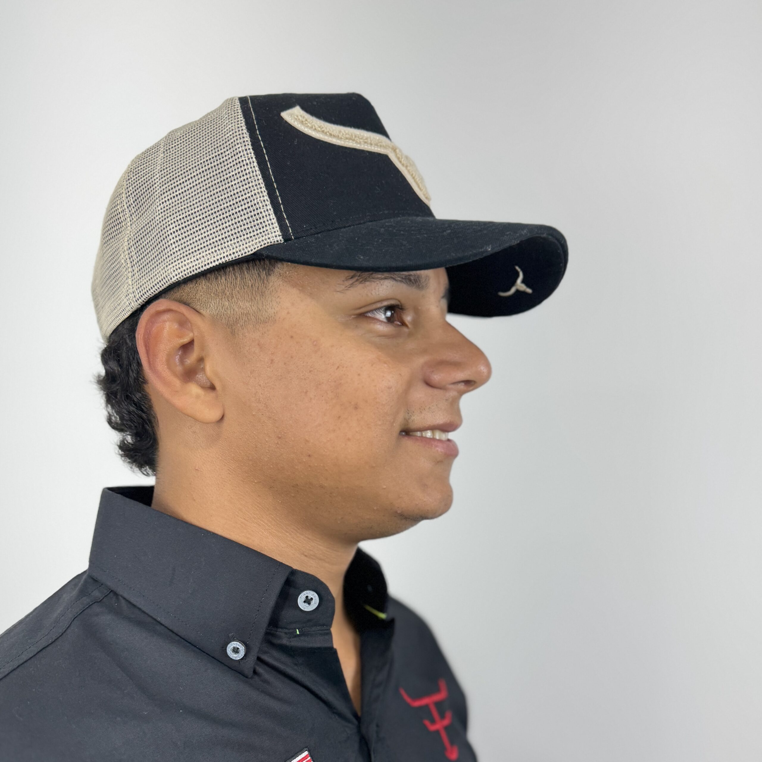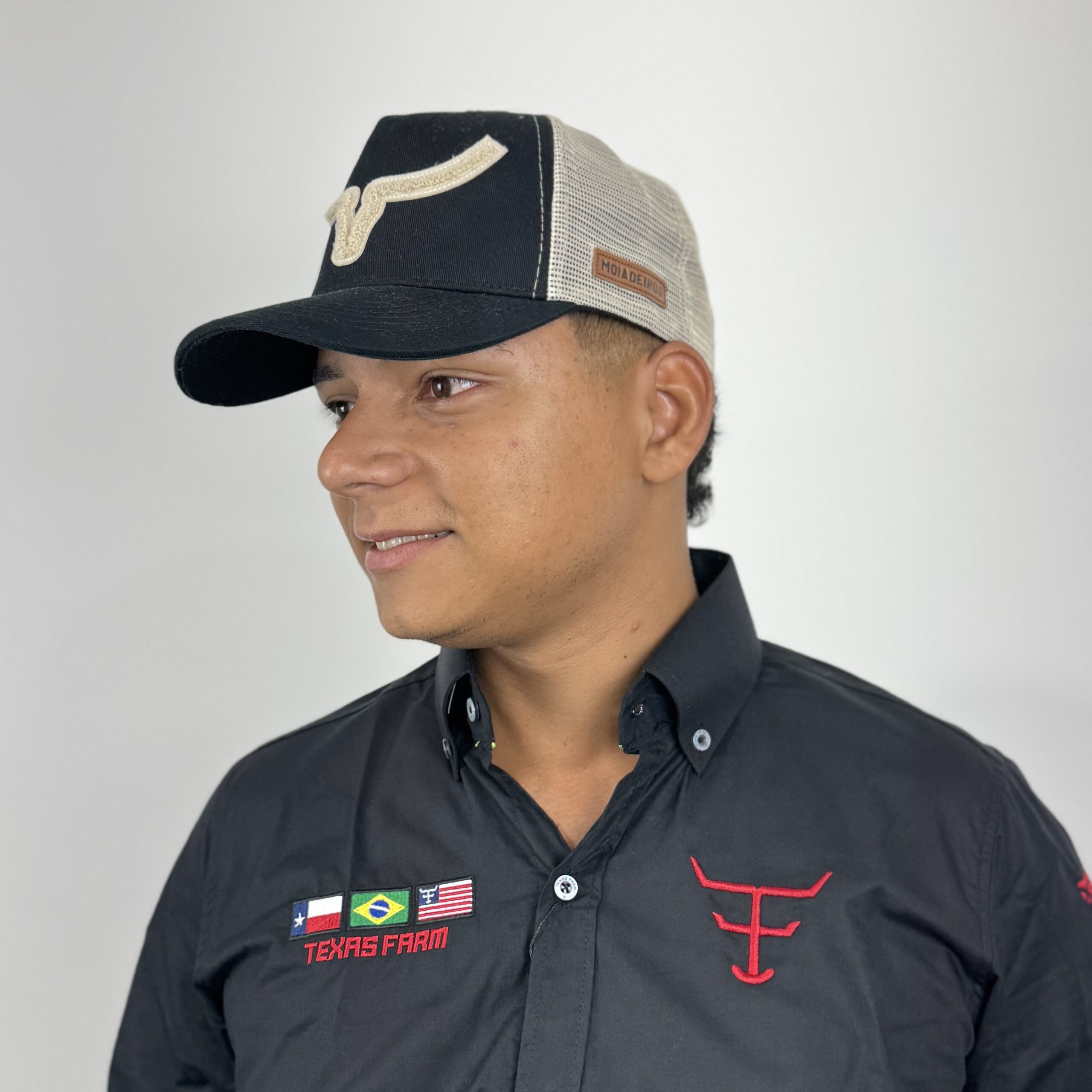 Boné Moiadeiros preto com a logo em alto relevo bordada na cor branca/bege