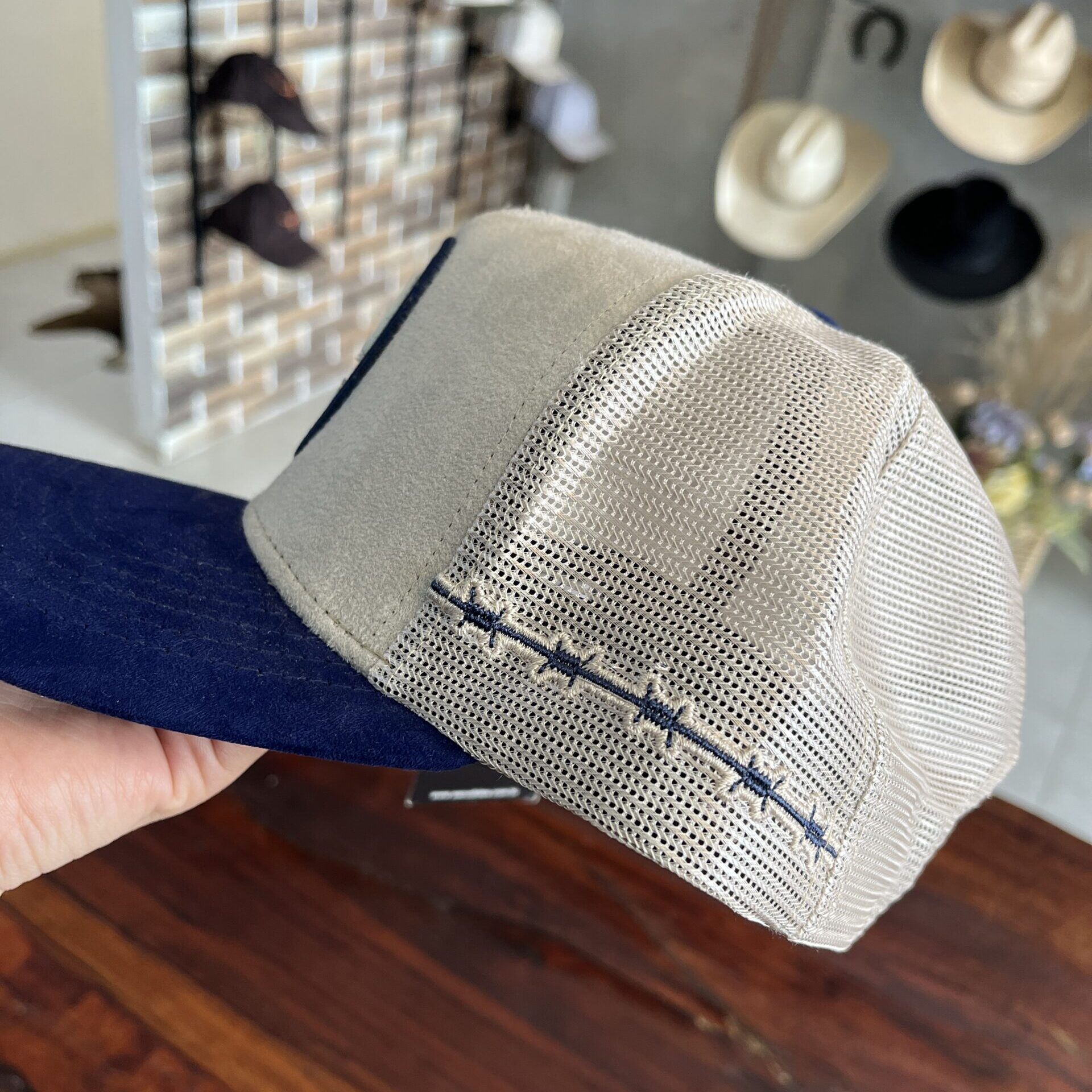 Testa na cor bege e aba na cor marinho.
