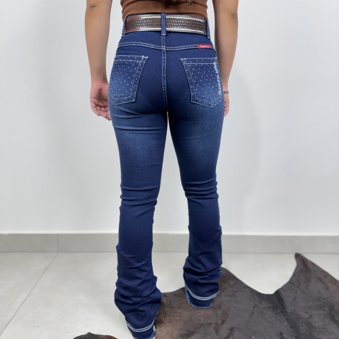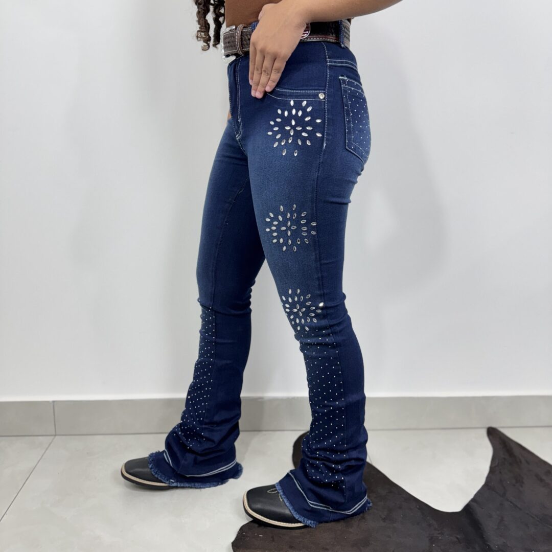 Calça Flare com dois bolsos na parte de trás, dois bolsos falsos na frente, costurada com linhas brancas, detalhes bordados no bolso traseiro e cravejada de pedras brilhantes.