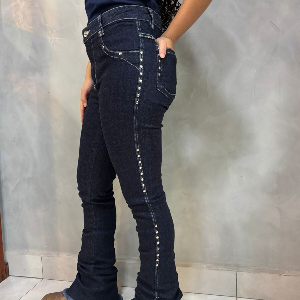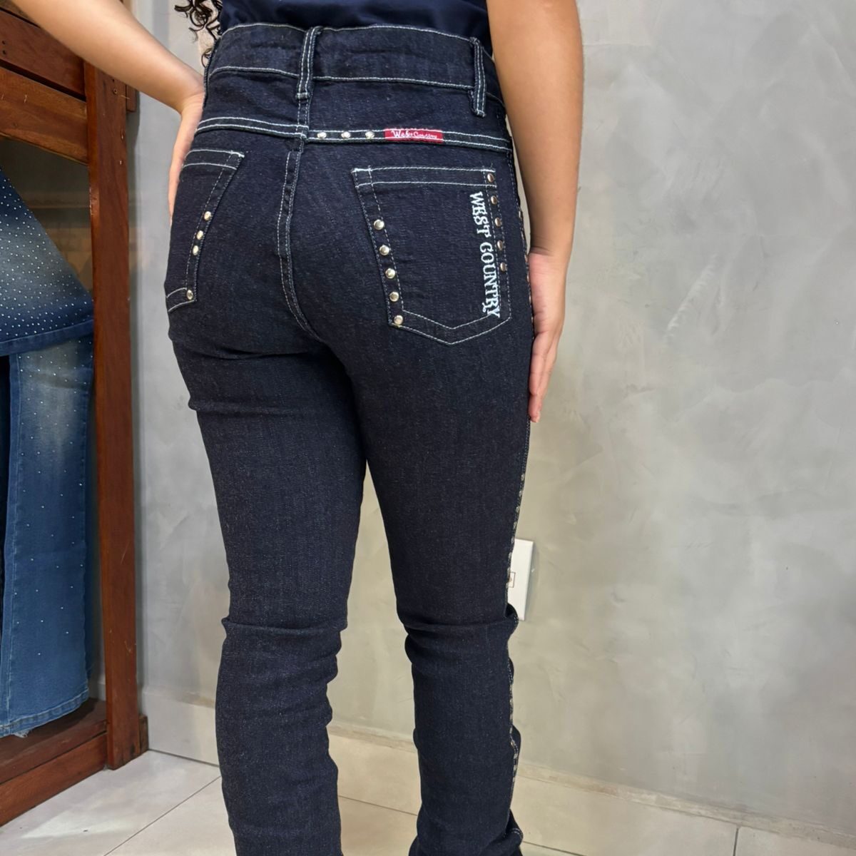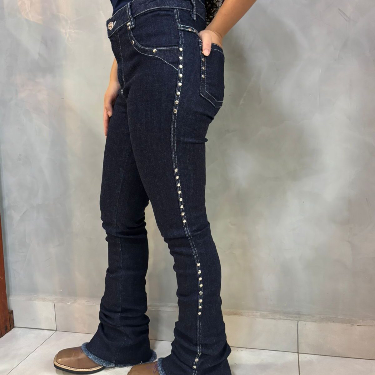 Calça jeans country feminina confeccionada em denim de alta qualidade, com lavagem escura que valoriza a silhueta e garante sofisticação ao visual. O destaque fica por conta das aplicações metálicas laterais, que trazem personalidade e um toque western elegante, sem perder a versatilidade.