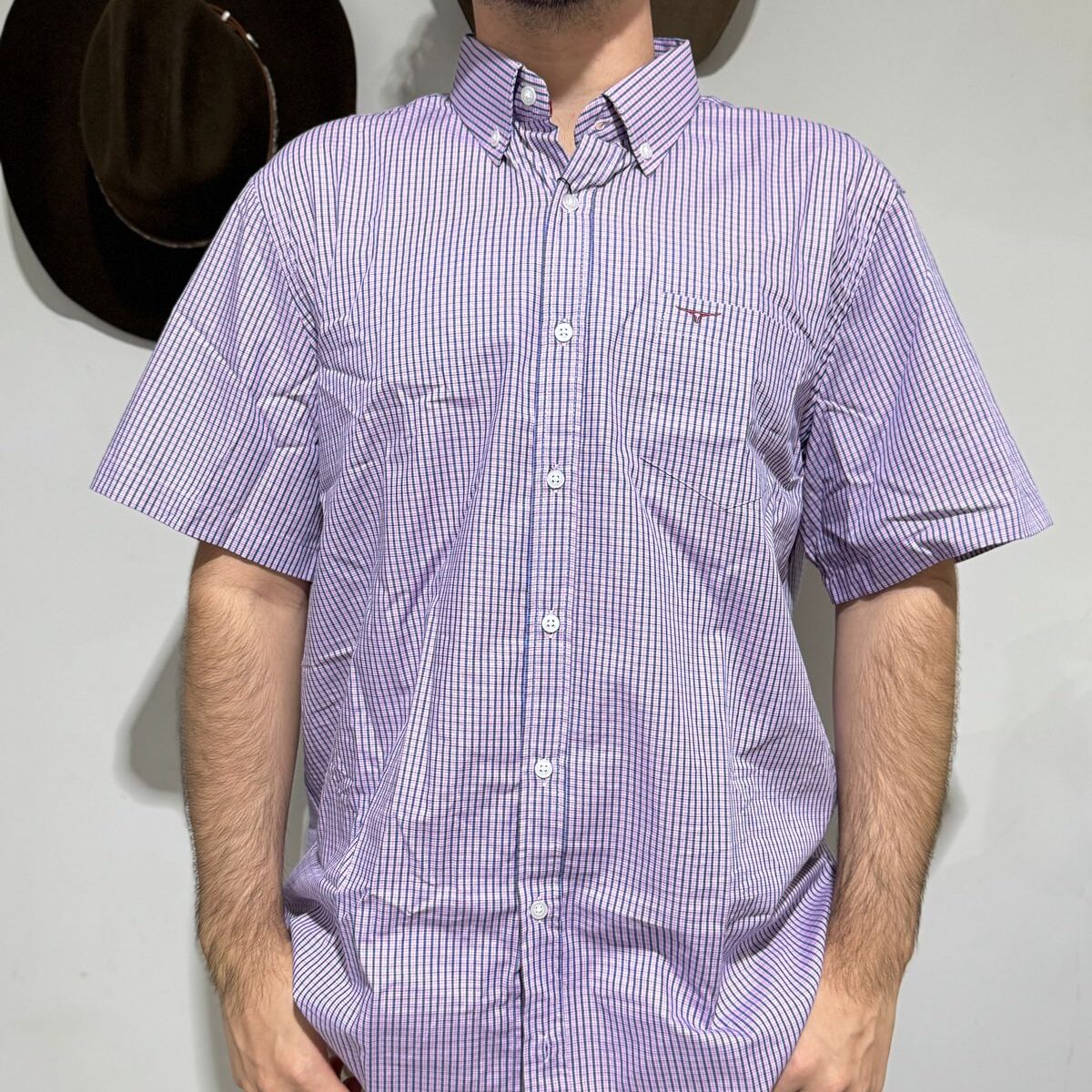 Camisa confeccionada em tecido de alta qualidade 100% algodão xadrez na cor roxo, manga curta com bolso frontal bordado a logomarca e fechamento em botão.