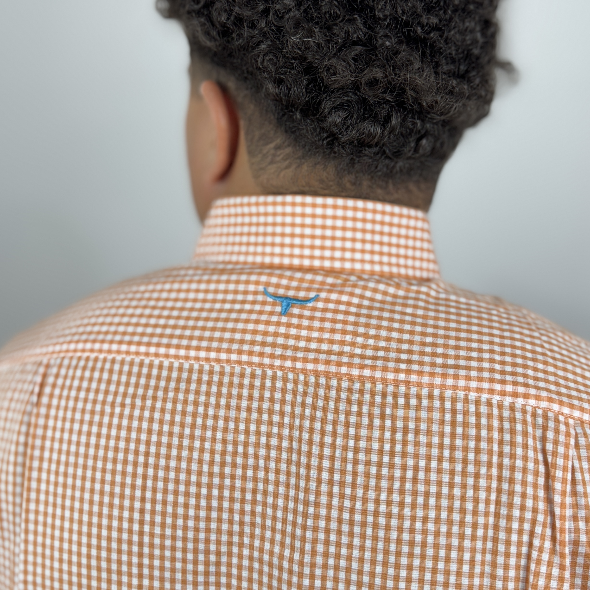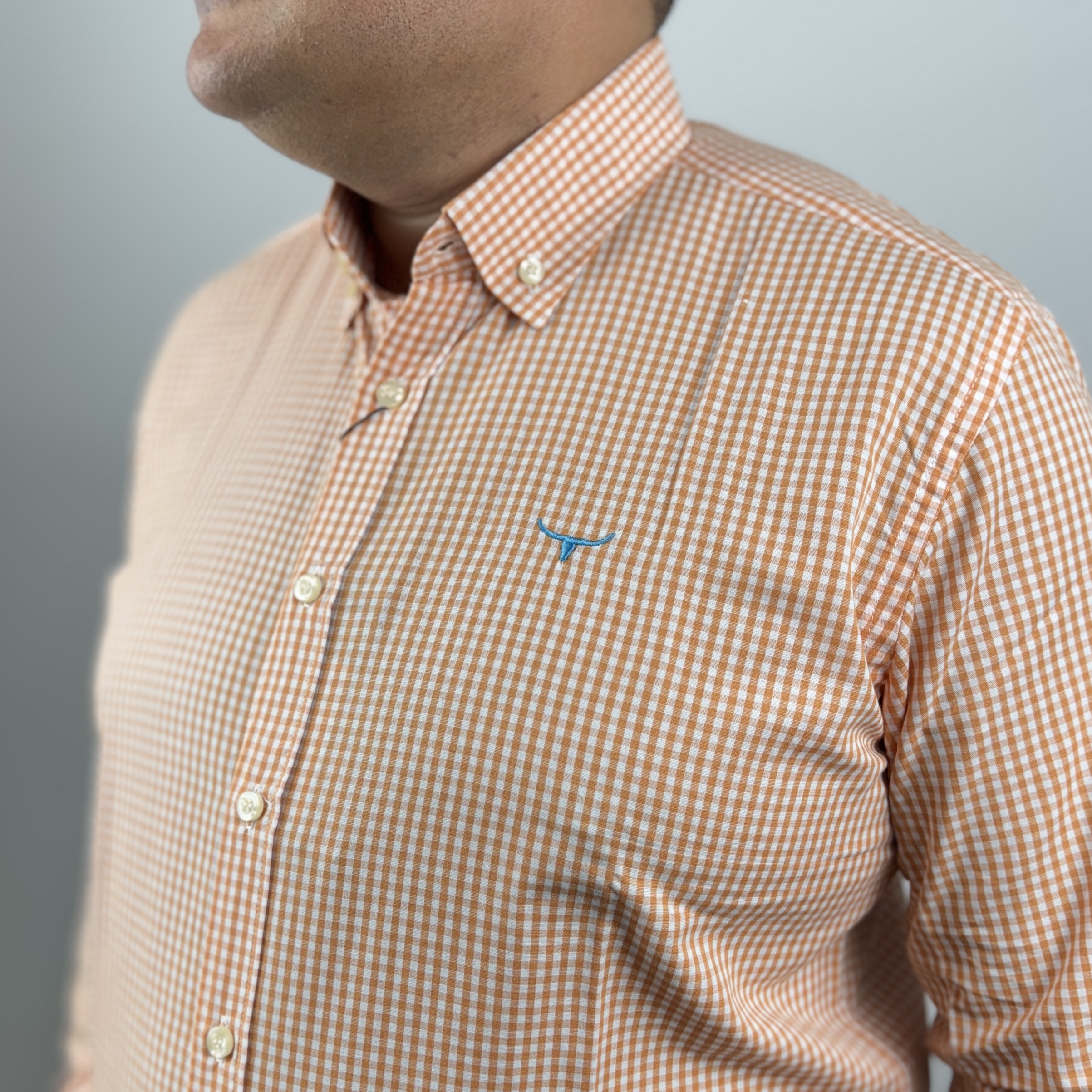 Confeccionada em tecido 100% Algodão, Xadrez na Cor laranja. Possui bordado do Logo na cor Azul Claro.