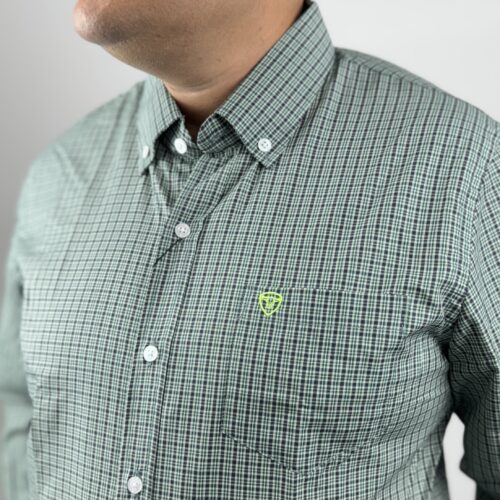 Camisa confeccionada em tecido de alta qualidade 100% algodão xadrez na cor verde com risco na cor preto e verde escuro, manga longa com bolso frontal bordado a logomarca na cor verde claro e fechamento em botão.