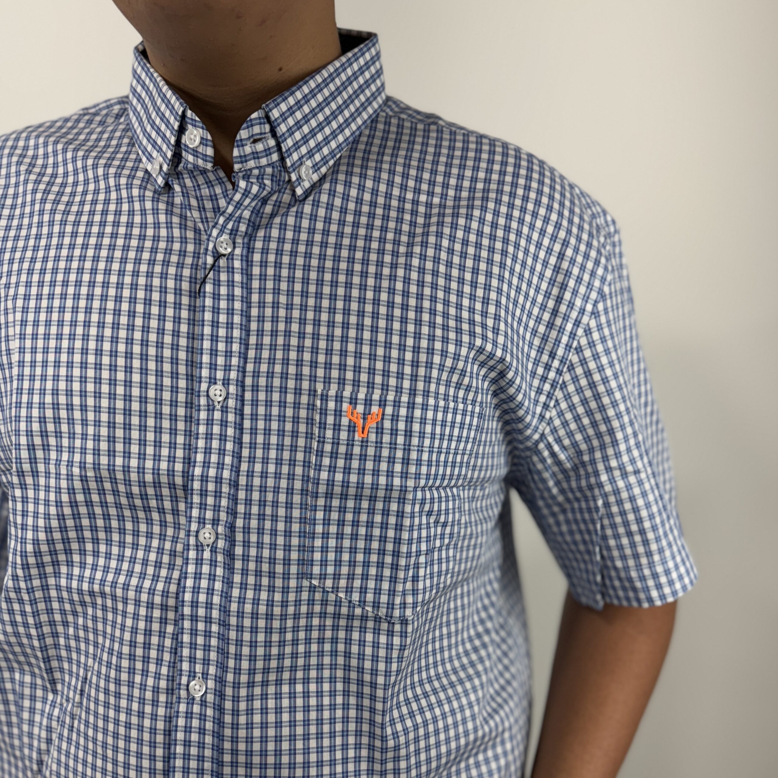 A camisa xadrez manga curta Gross Hunter, é a peça perfeita para quem busca sofisticação e versatilidade. Seu design minimalista, na cor azul, traz um toque moderno e autentico ao visual. O logo da marca, bordado em laranja neon no peito esquerdo sobre o bolso, adiciona um contraste elegante sem perder a essência country da Gross Hunter.
