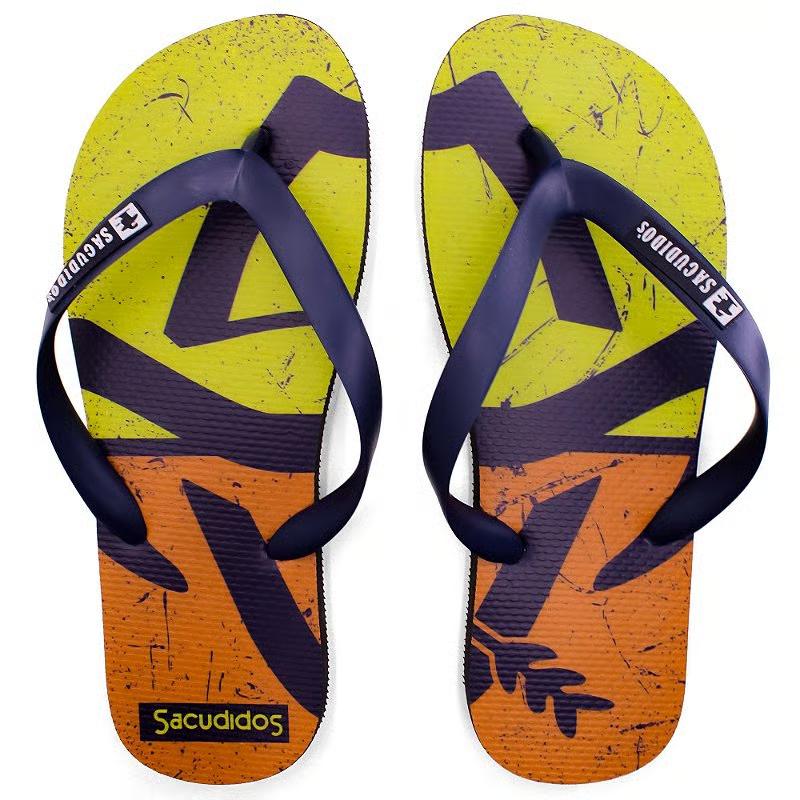 A composição do chinelo é: sola 30% EVA e 70% Borracha, e a tira toda em PVC, com a marca Sacudido´s injetada.