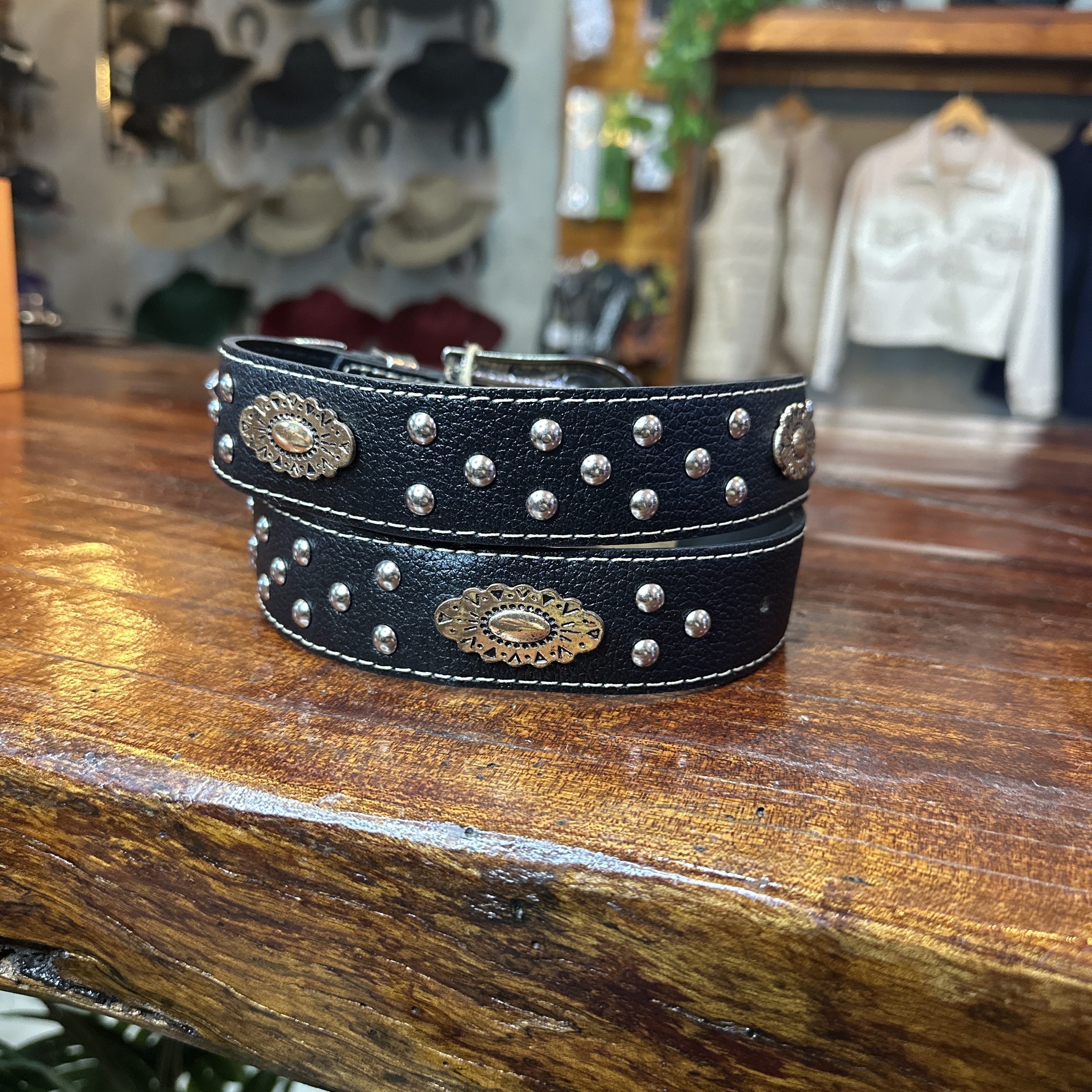 Cinto em couro com fivela e ponteira de prata, detalhes em tachinhas pratas e uma aplicação dourada.