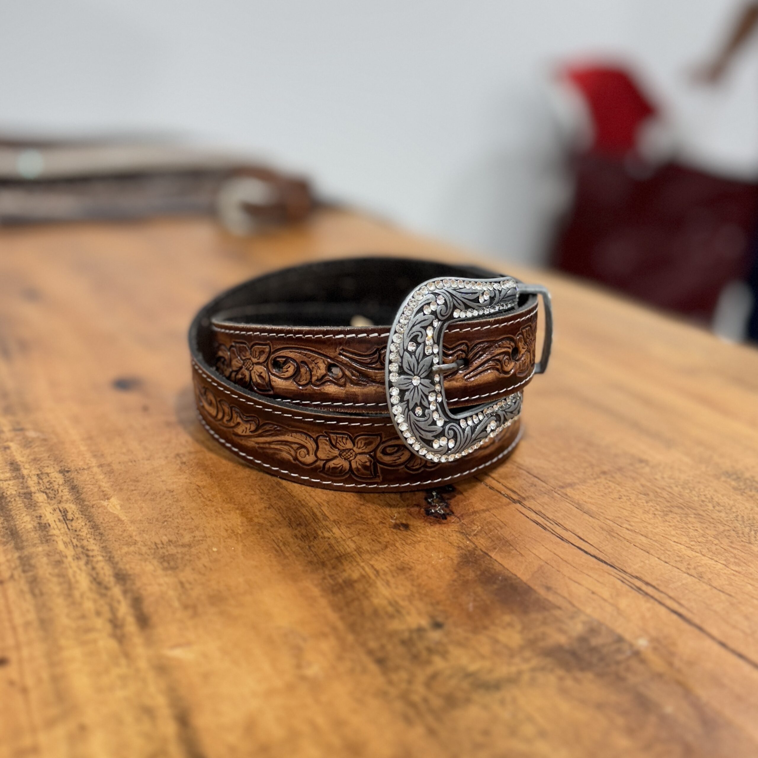 Fivela e ponteira em prata com desenhos de flores e strass.