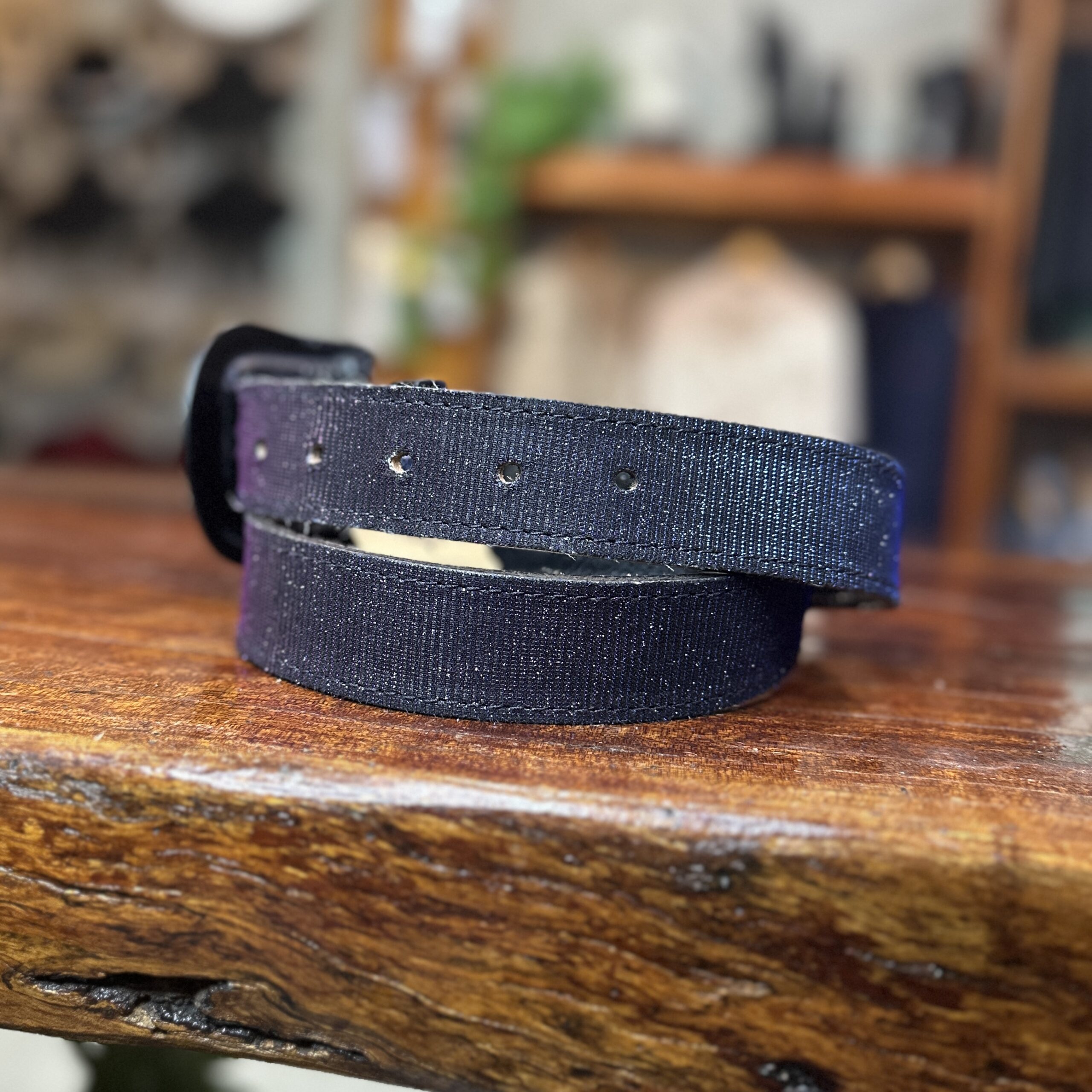 Cinto com fivela preta cravejada em strass. Cinto com gliter na cor roxa, furta cor.