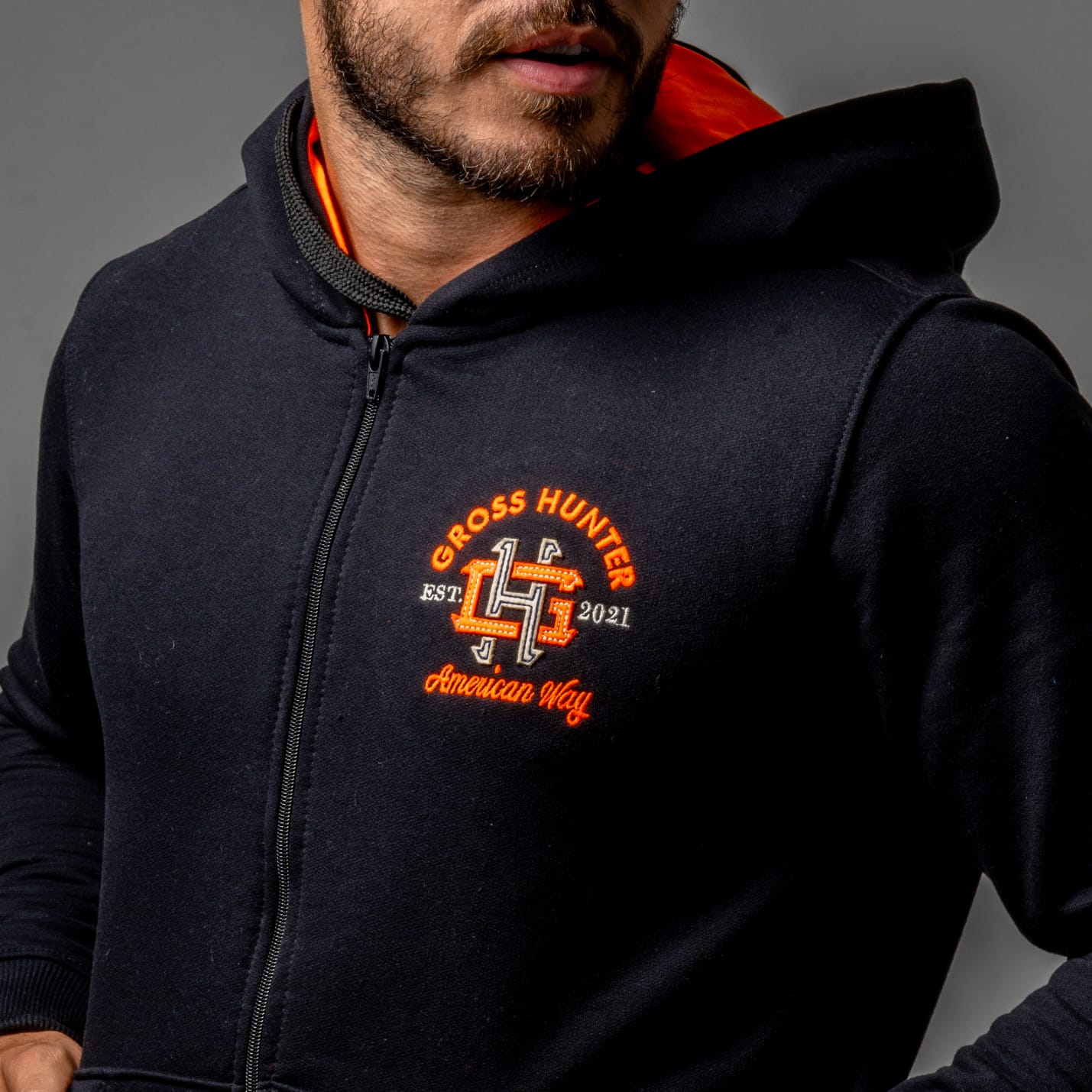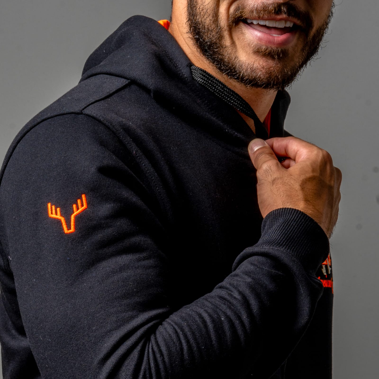 Peito esquerdo com aplique de feltro com a logo da marca na cor laranja. Cadarço achatado com ponteiras emborrachadas. Capuz com forro laranja.