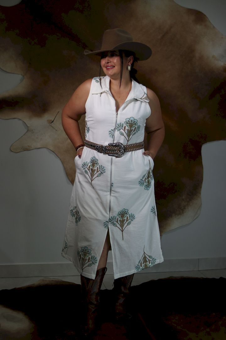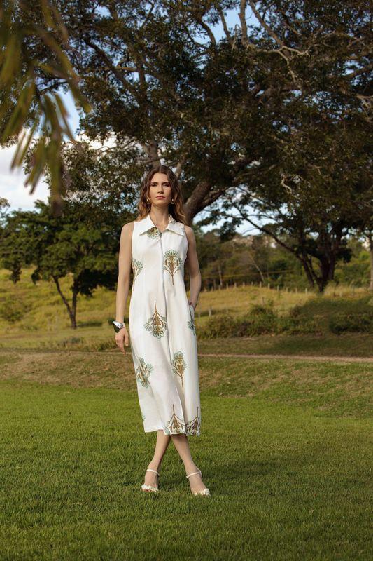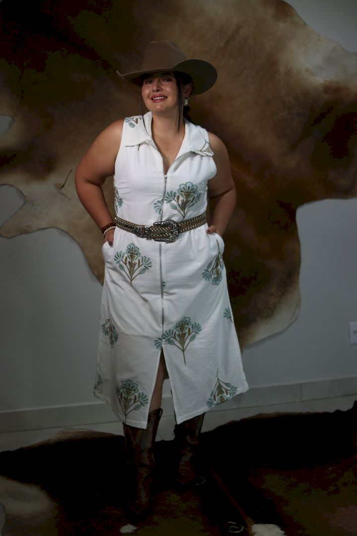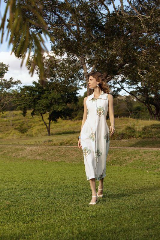 Vestido off white com bordados azul bebê e verde água, com zíper prata frontal, cavado com gola.