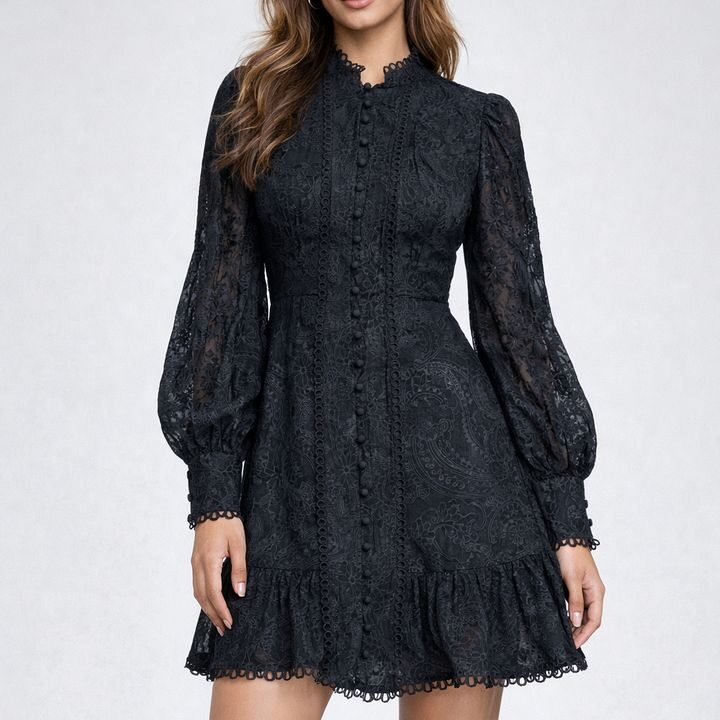 VESTIDO RENDADO COM BABADO E BOTOES ENCAPADOS